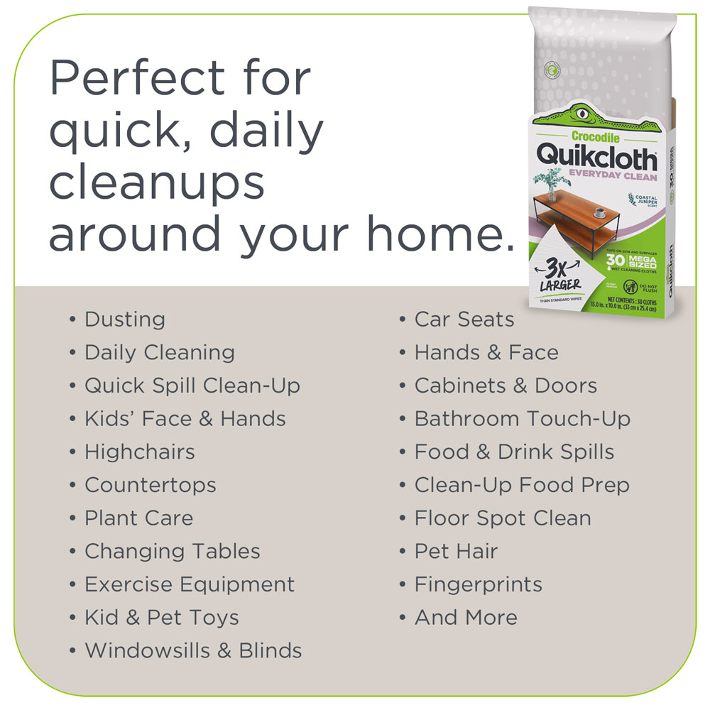 Everyday Clean’s plant-powered formula and thick, ultra-soft cloths tackle messes effortlessly while staying gentle on surfaces and skin. Whether you’re dusting, wiping down a highchair, or tidying up the kitchen for the night, these cleaning cloths set the standard—you’ll never go back to dishcloths, rags, or sponges! And because these plastic-free cleaning cloths are formulated without dyes, bleach or ammonia, you get all the convenience and safety of a disposable product with none of the guilt. Quikcloth® Everyday Clean is the smarter, fresher way to keep your home spotless.